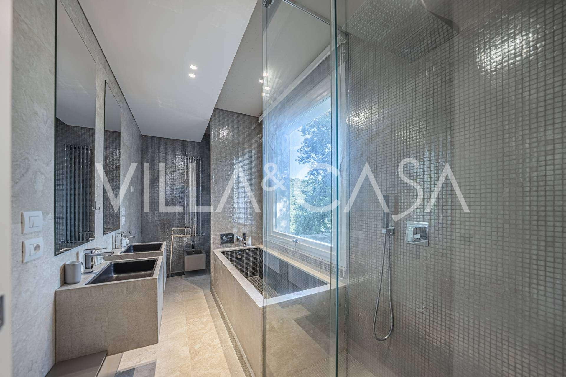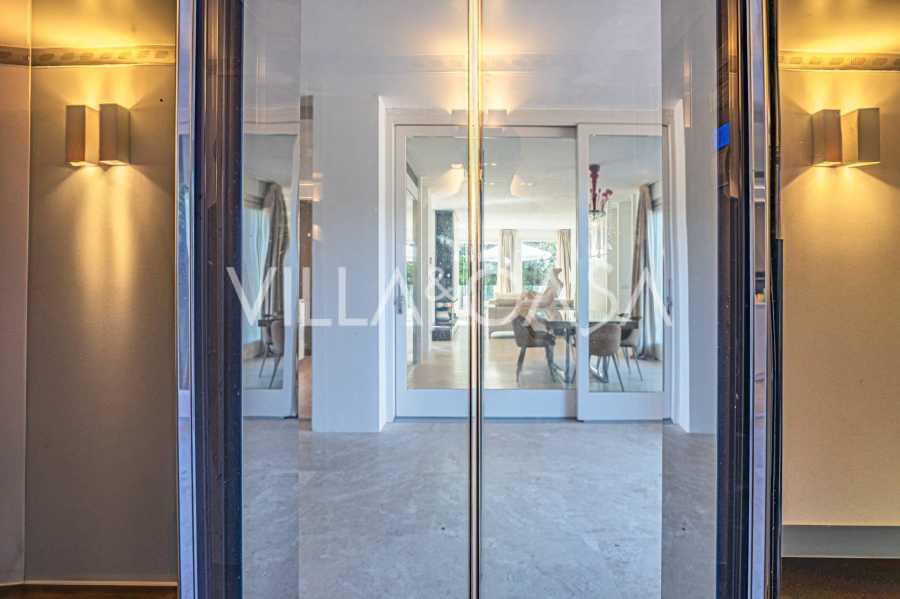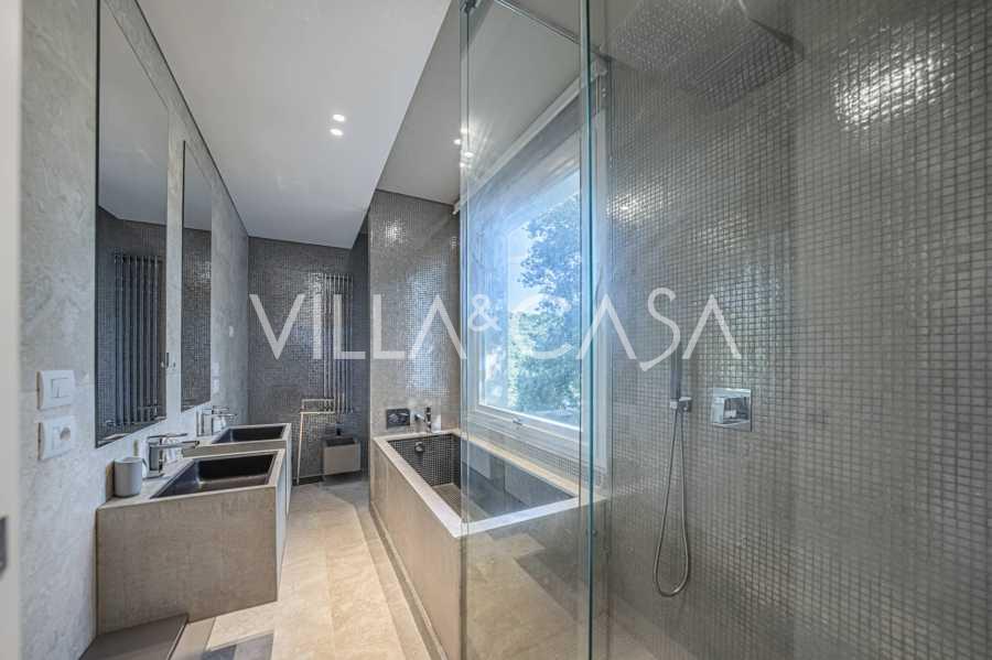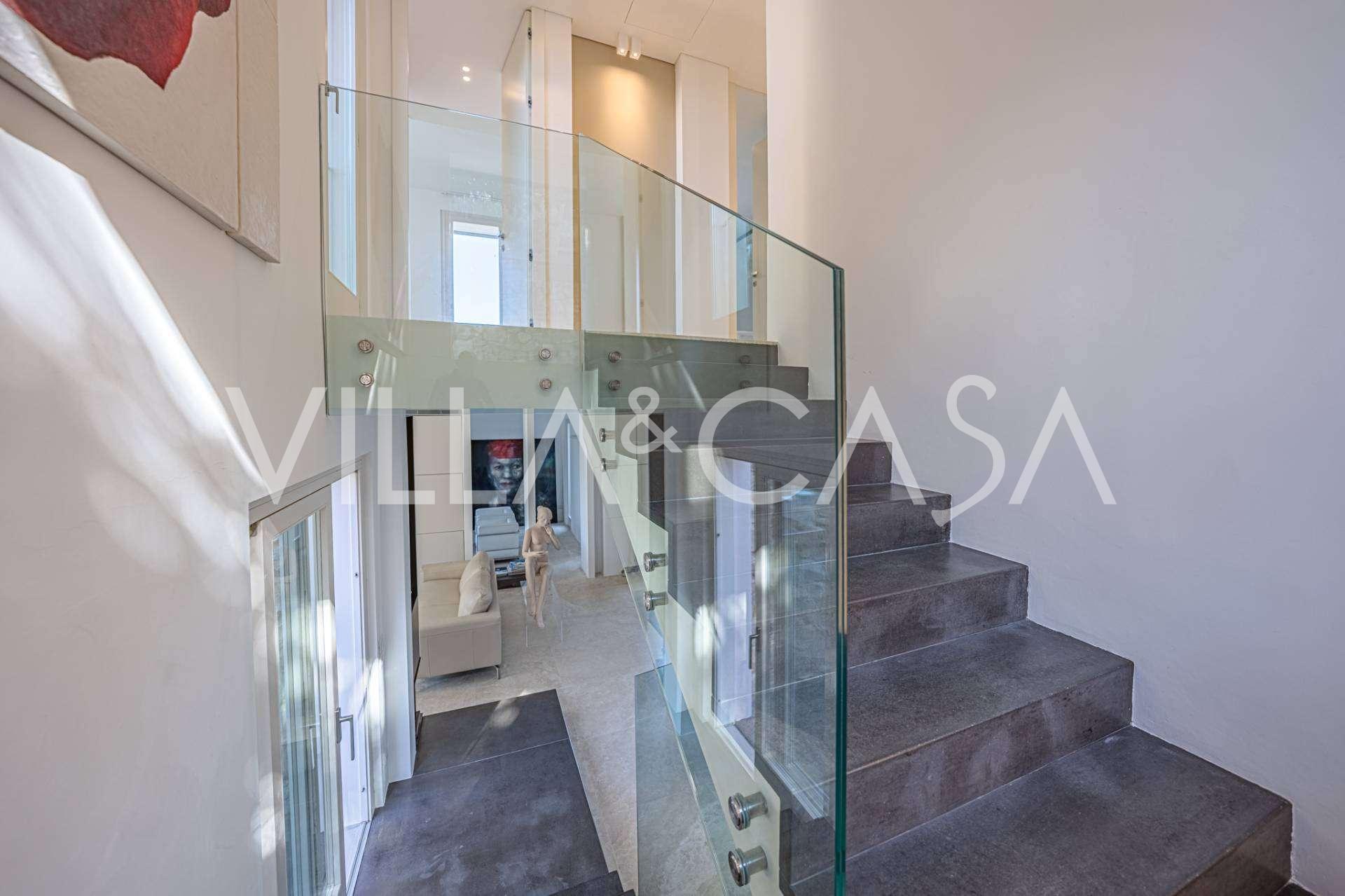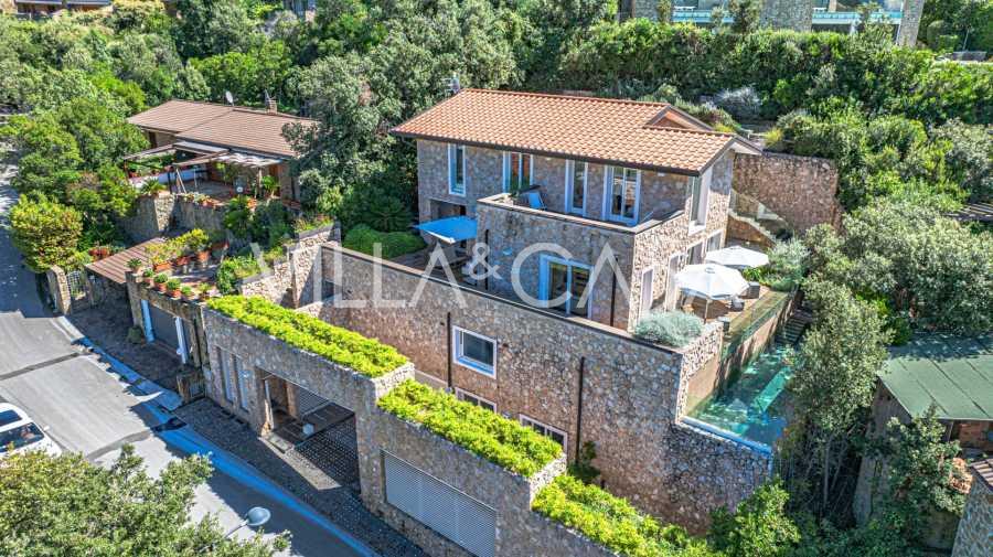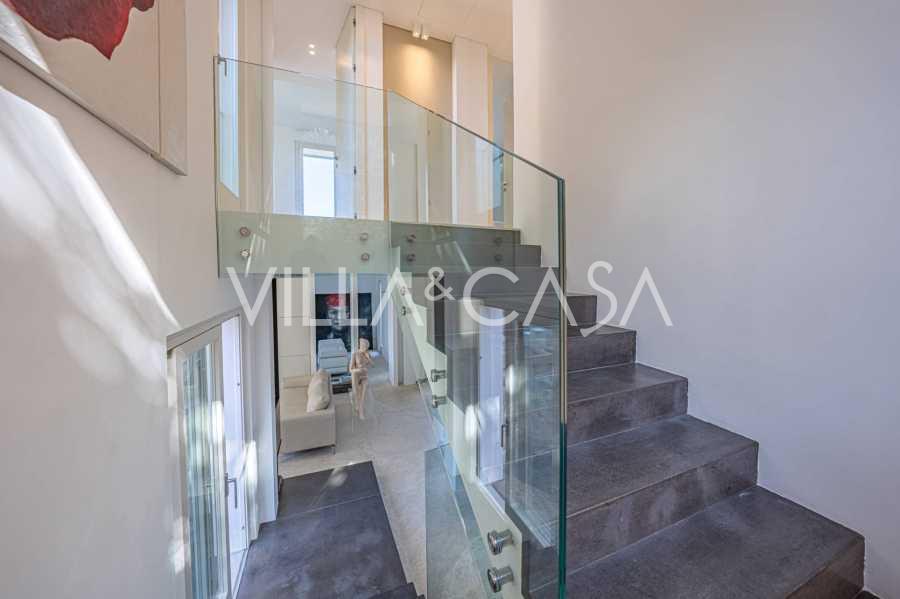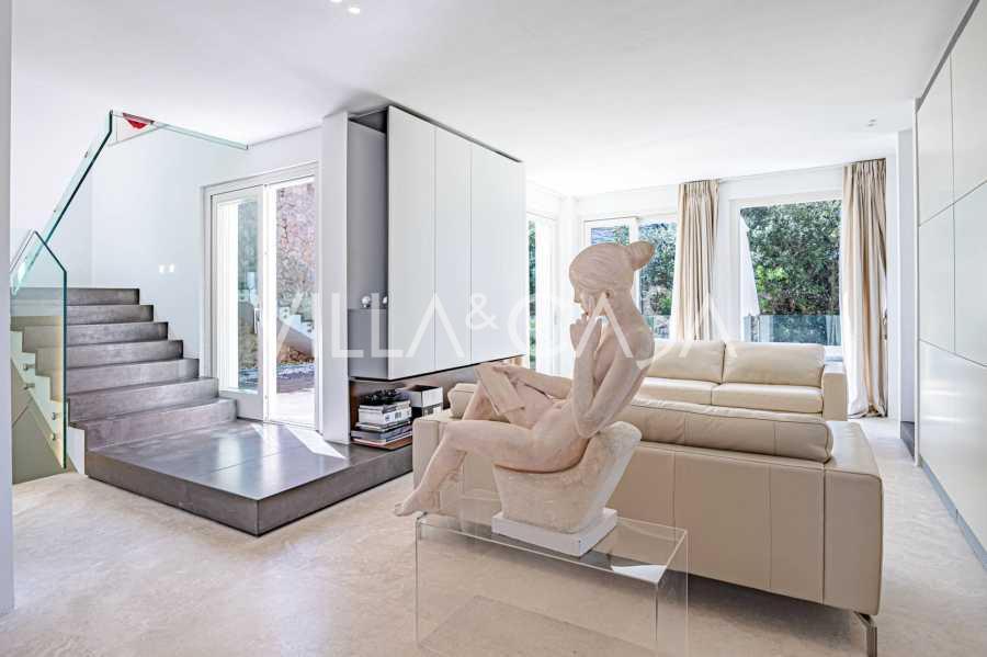 Recentemente totalmente renovada e distribuída em quatro níveis, conectados por um elevador interno, a residência exibe uma rara elegância e funcionalidade refinada. A arquitetura, com suas linhas impecáveis e fachadas de vidro, cria harmonia entre os espaços internos e os encantadores terraços. A villa é cercada por um jardim em terraço bem cuidado de 500 m², oferecendo aos proprietários privacidade e tranquilidade, onde também está escondida uma sofisticada área de lazer com piscina.