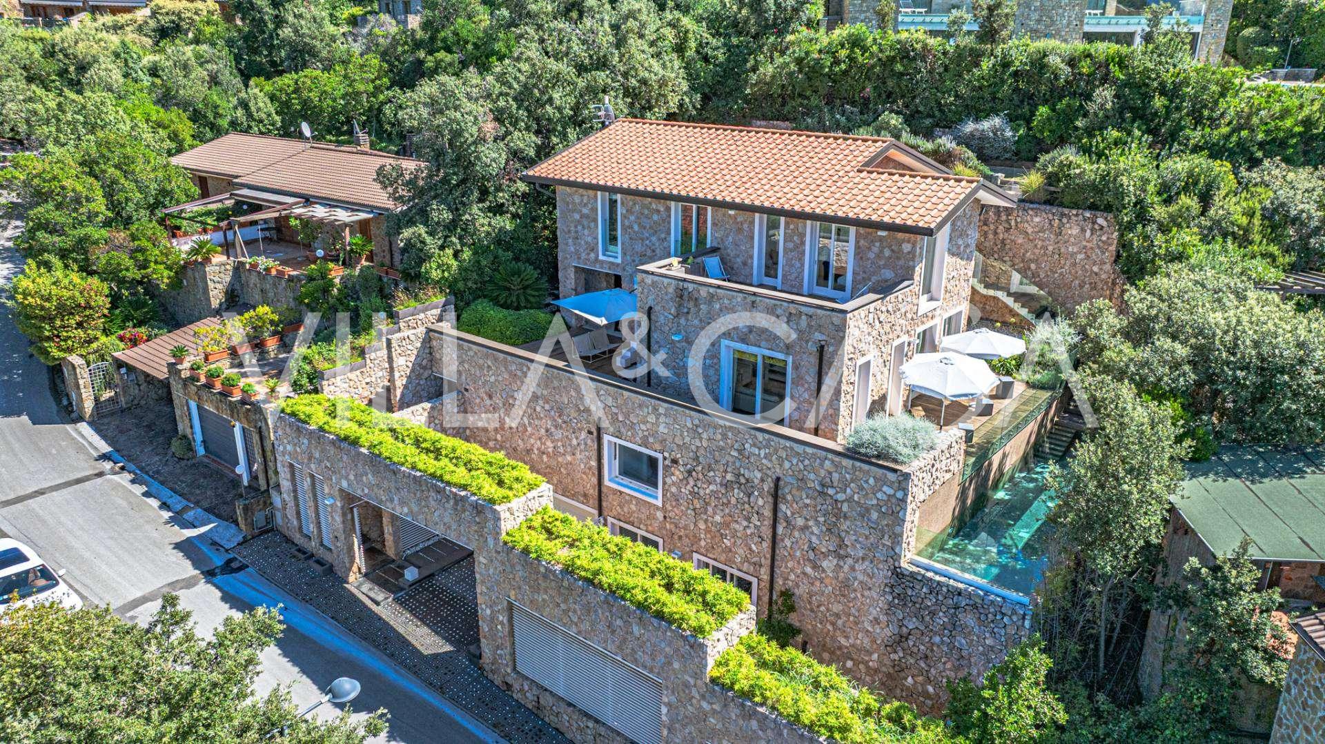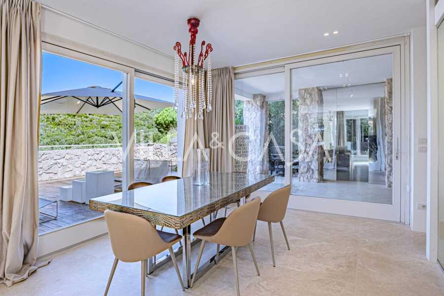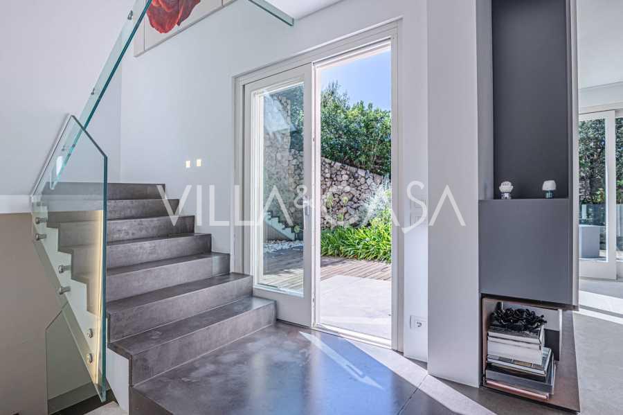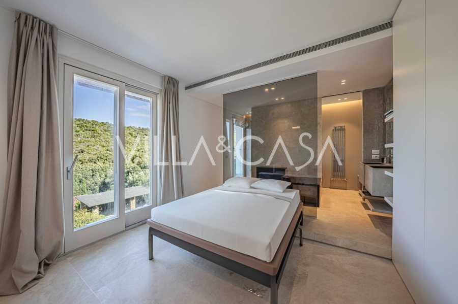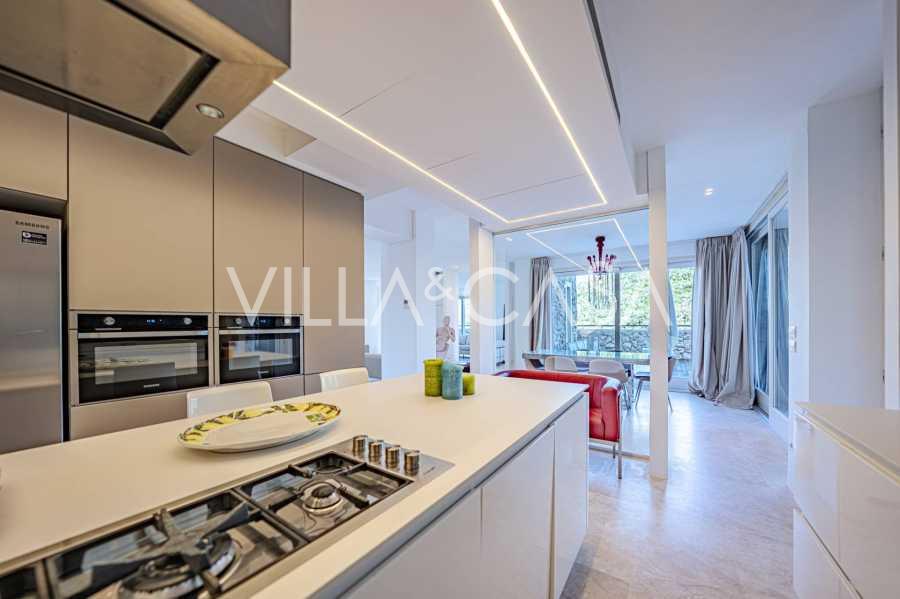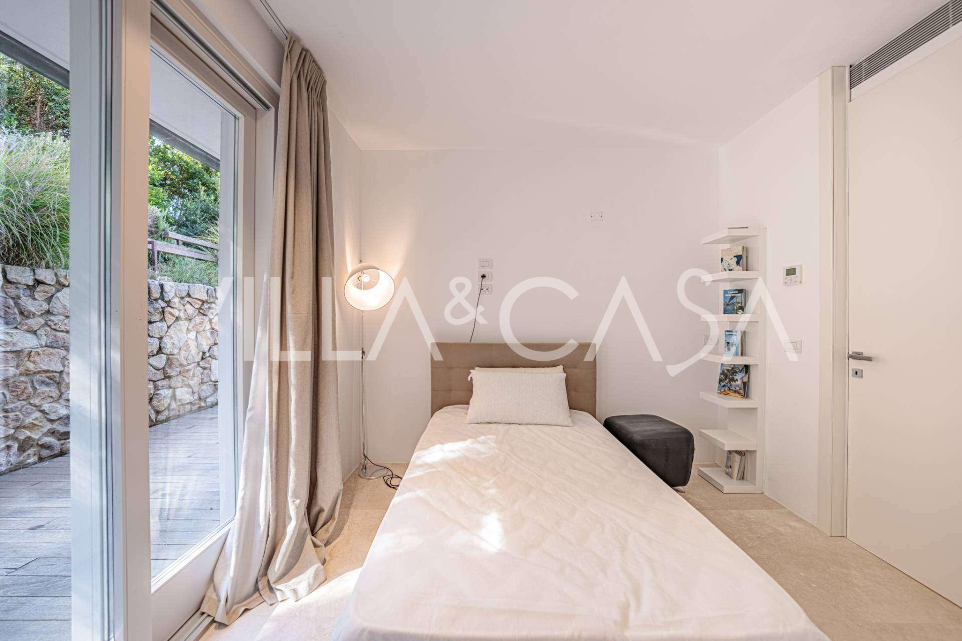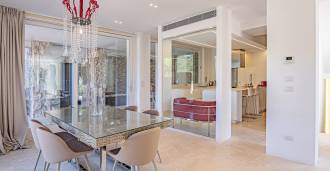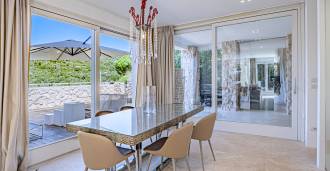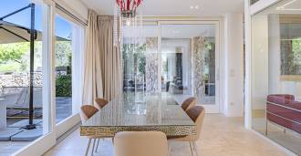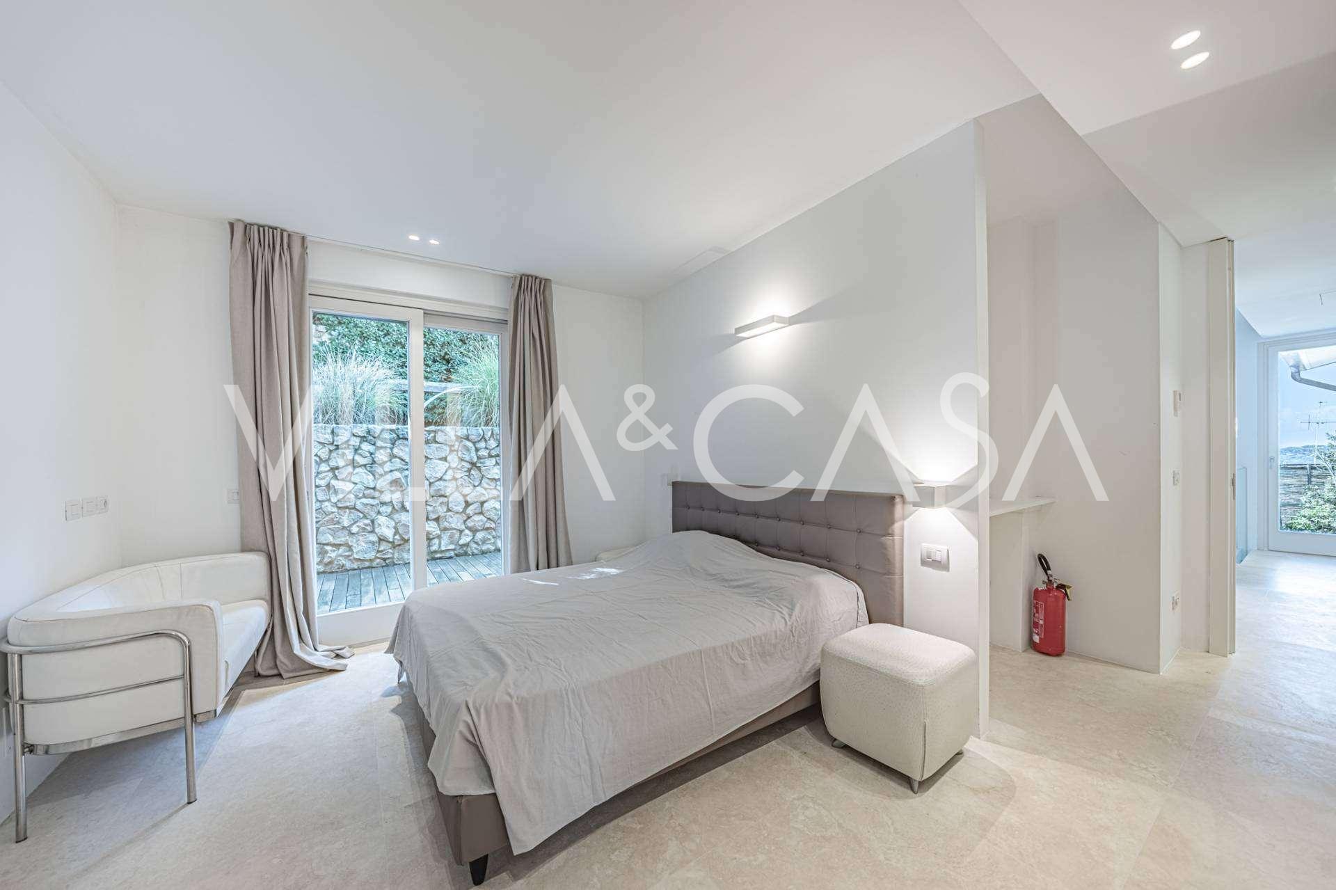 Recentemente totalmente renovada e distribuída em quatro níveis, conectados por um elevador interno, a residência exibe uma rara elegância e funcionalidade refinada. A arquitetura, com suas linhas impecáveis e fachadas de vidro, cria harmonia entre os espaços internos e os encantadores terraços. A villa é cercada por um jardim em terraço bem cuidado de 500 m², oferecendo aos proprietários privacidade e tranquilidade, onde também está escondida uma sofisticada área de lazer com piscina.