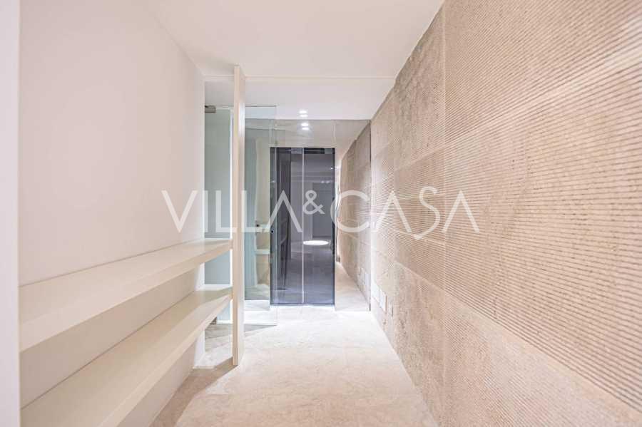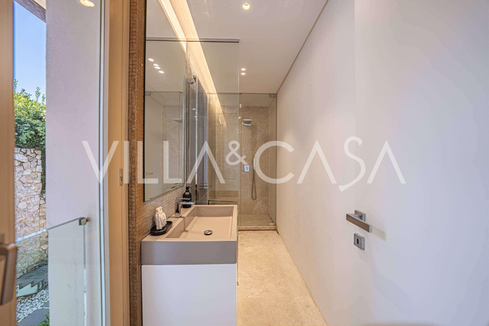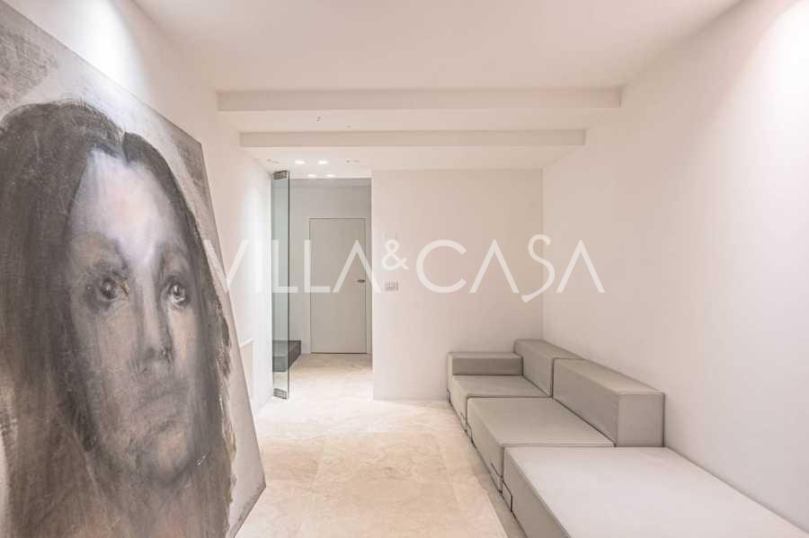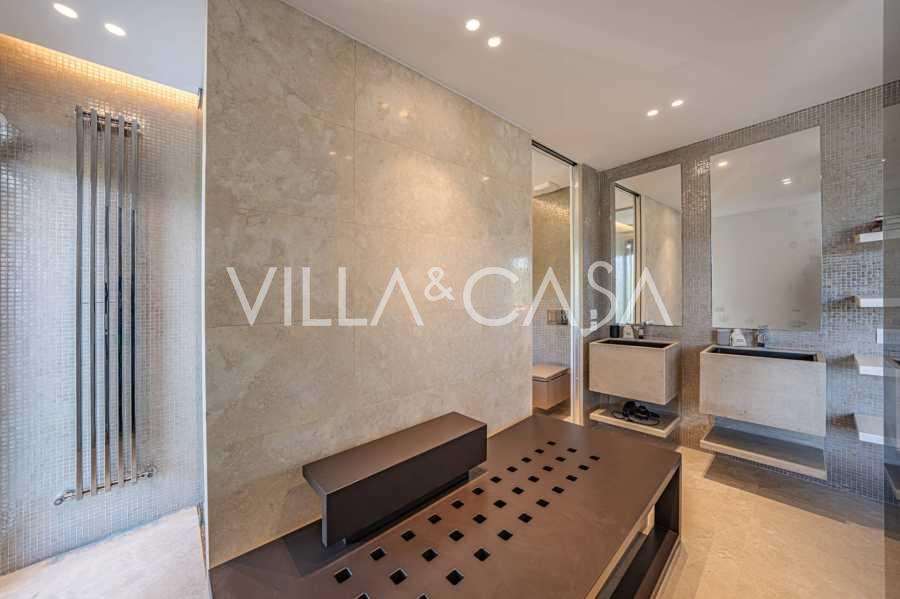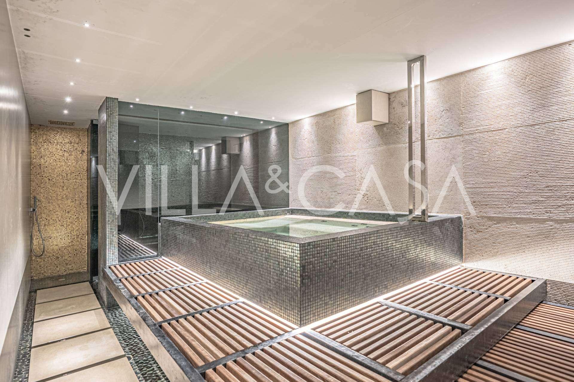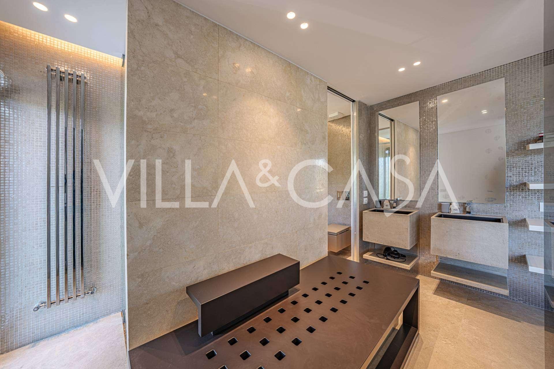 No nível do jardim, há um apartamento separado com entrada independente, ideal para hóspedes ou funcionários. Na parte inferior da villa, encontra-se uma magnífica área de bem-estar: uma espaçosa banheira de hidromassagem, um hammam turco, uma sala privada para relaxamento, além de um quarto adicional com banheiro privativo e áreas de armazenamento, incluindo uma adega.