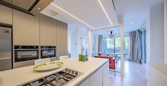 A área total dos espaços internos é de 380 m². No primeiro andar, encontra-se uma magnífica área de recepção com uma espaçosa sala de estar, que leva a um grande terraço de jantar com vista para o mar, uma sala de estar requintada e uma elegante sala de jantar conectada a uma cozinha de alta qualidade totalmente equipada.