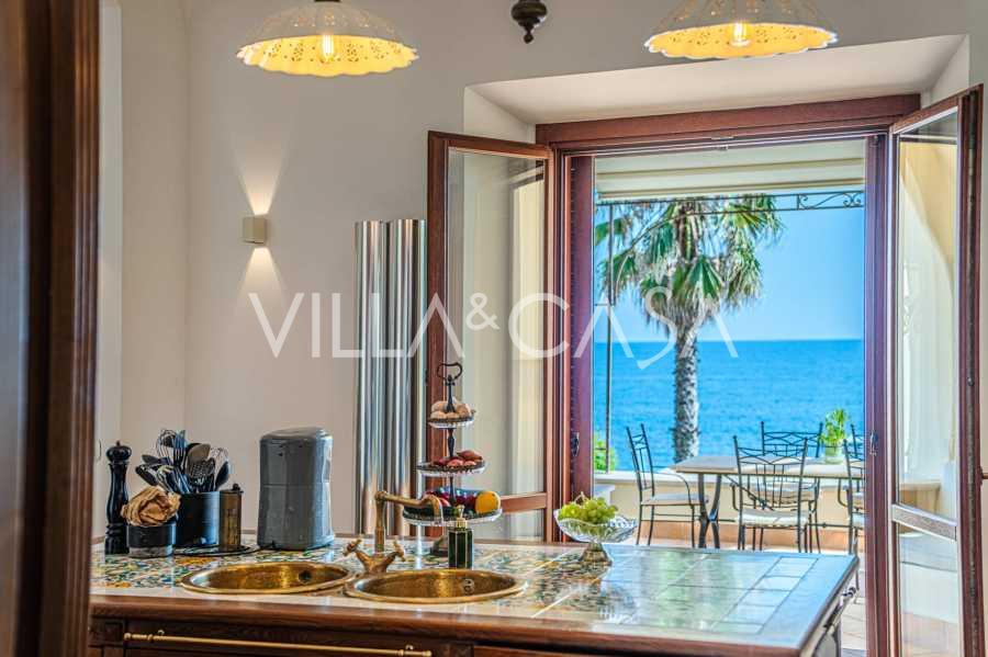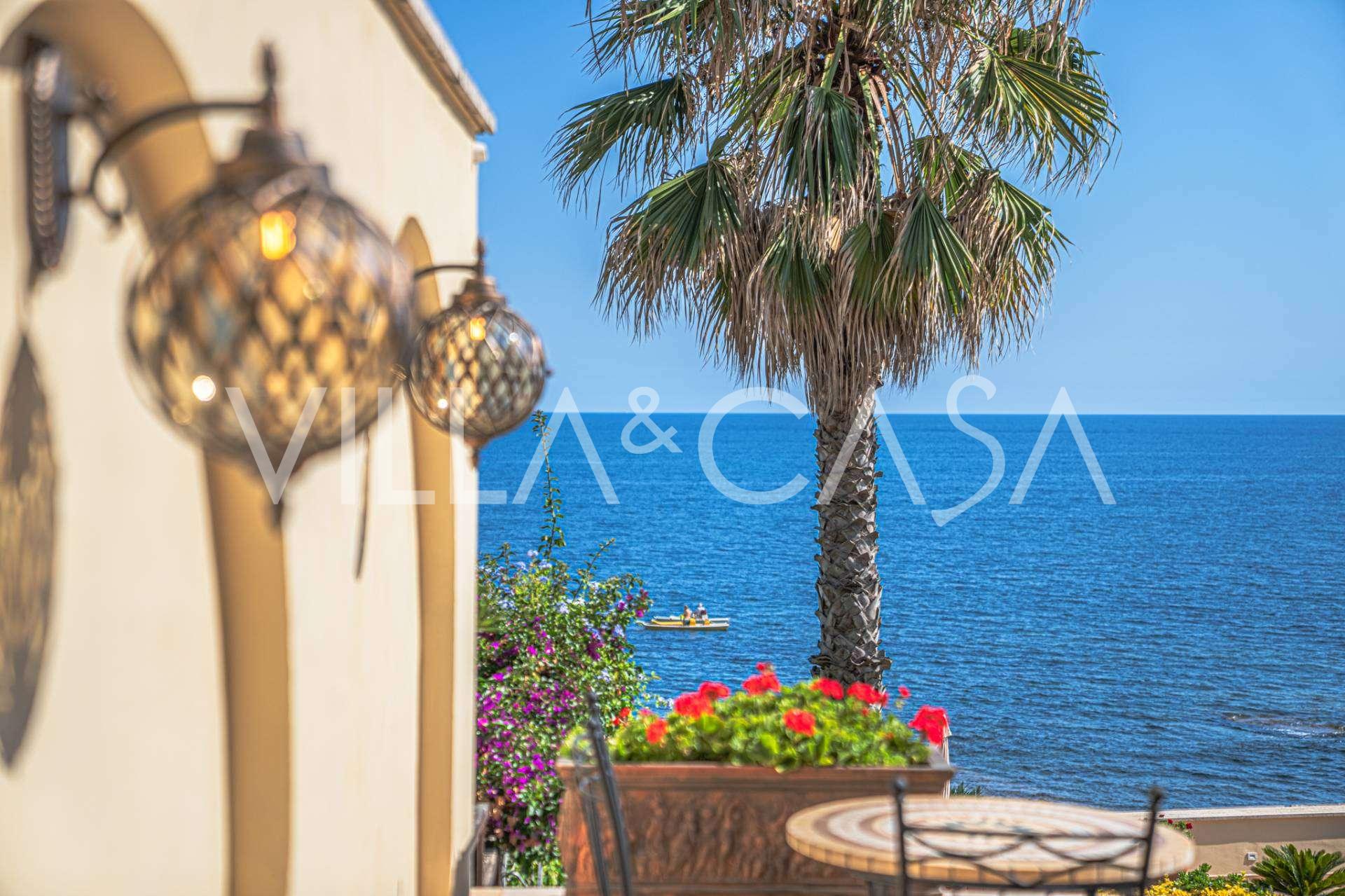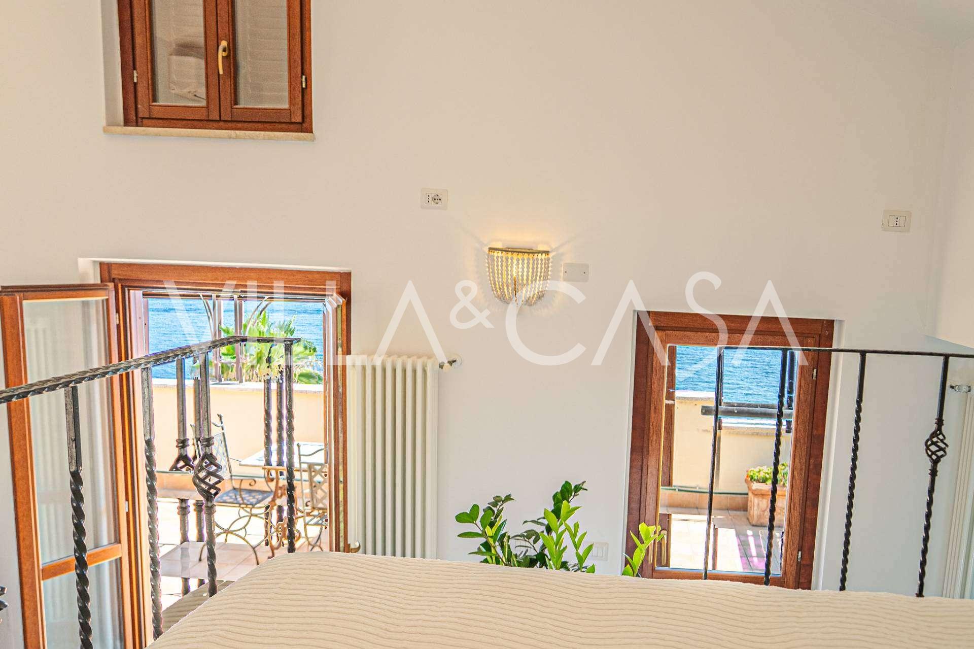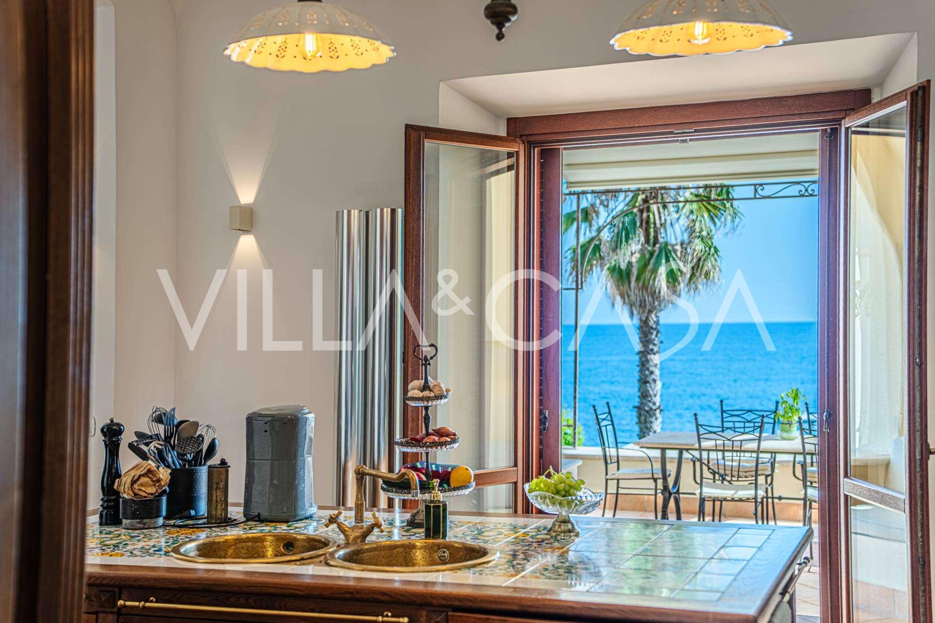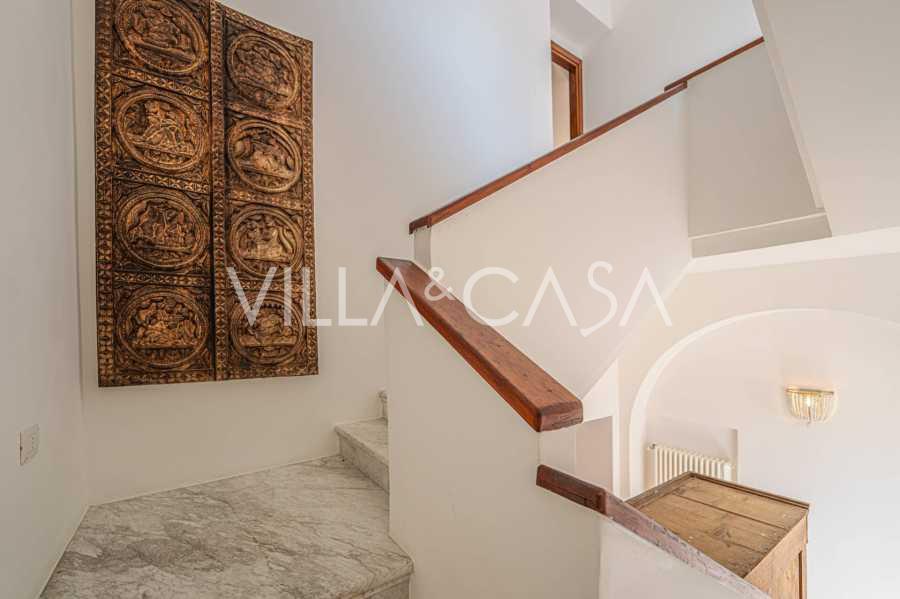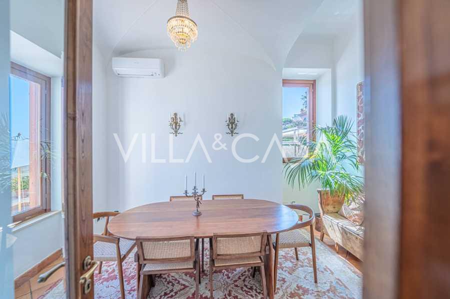 As janelas oferecem uma vista panorâmica de 180 graus para o mar, com o horizonte azul preenchendo cada espaço interior e se estendendo até os amplos terraços panorâmicos. Os interiores, com tetos altos de mais de três metros, pisos de terracota da época, escada de mármore e lareira, criam uma atmosfera de elegância refinada e eterna.
