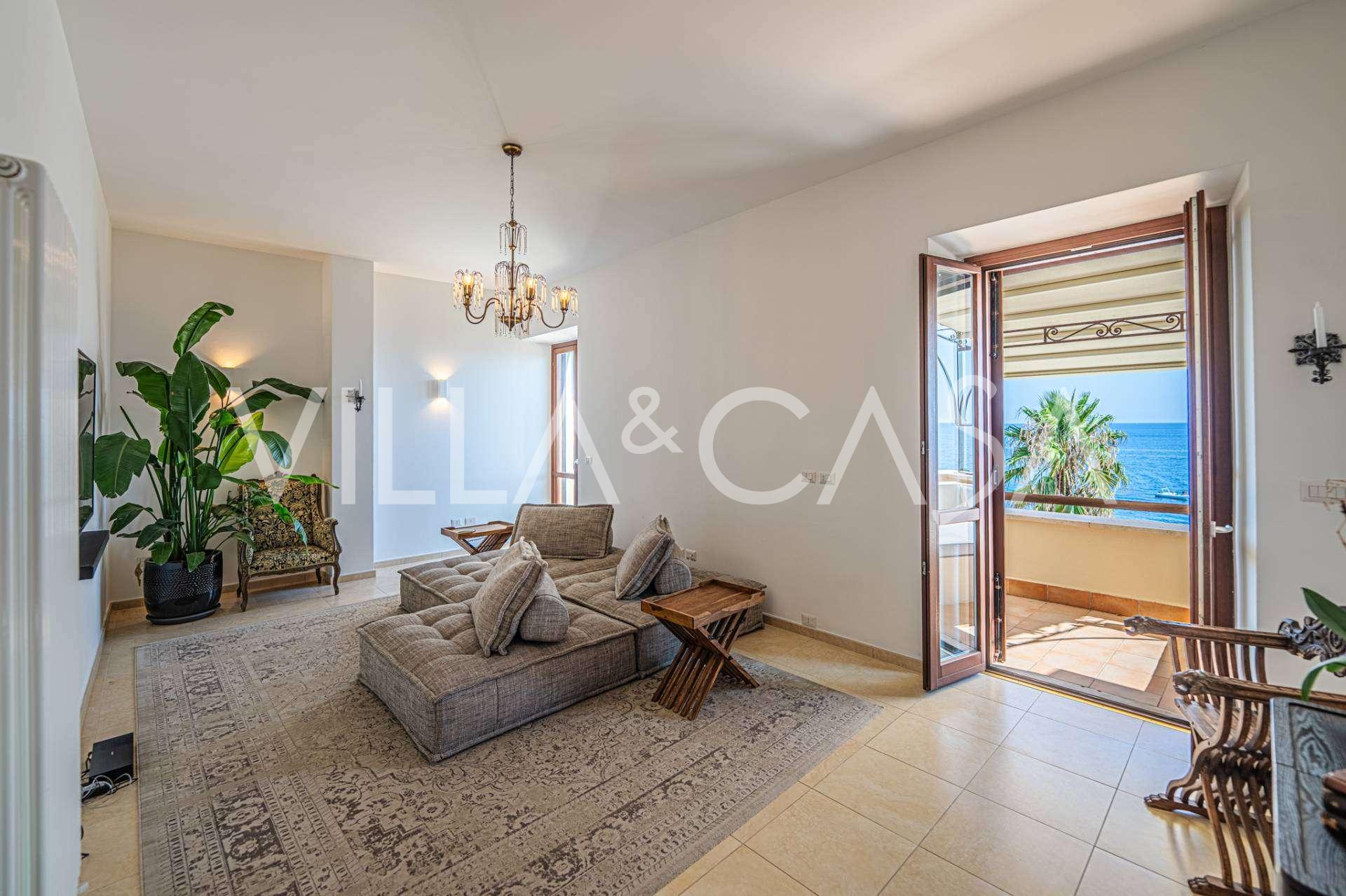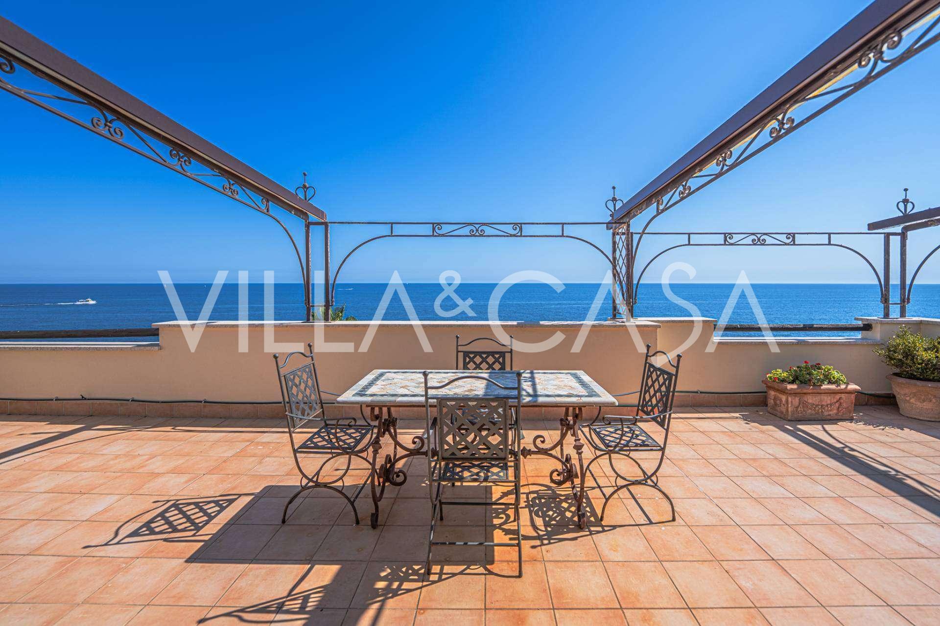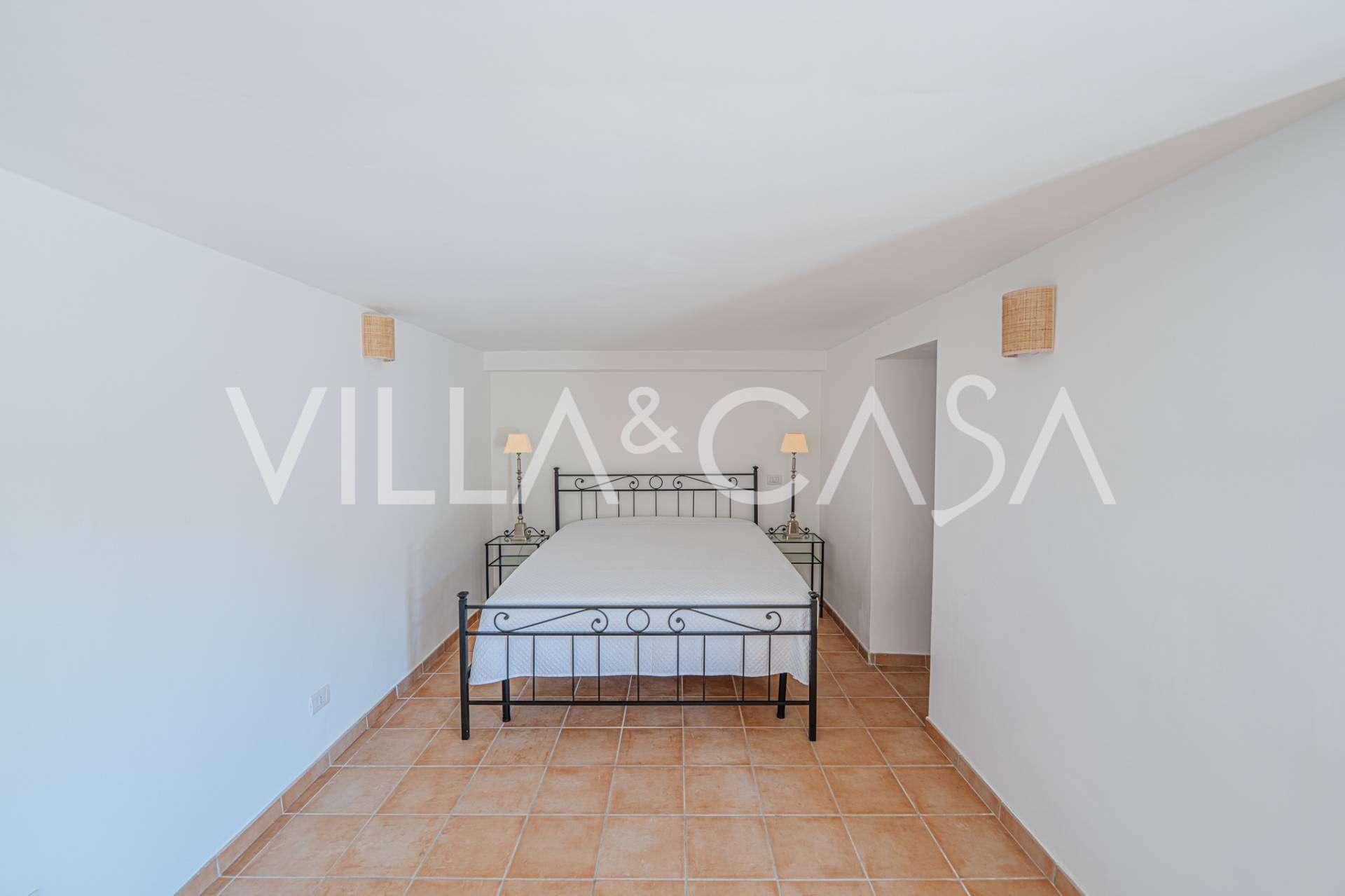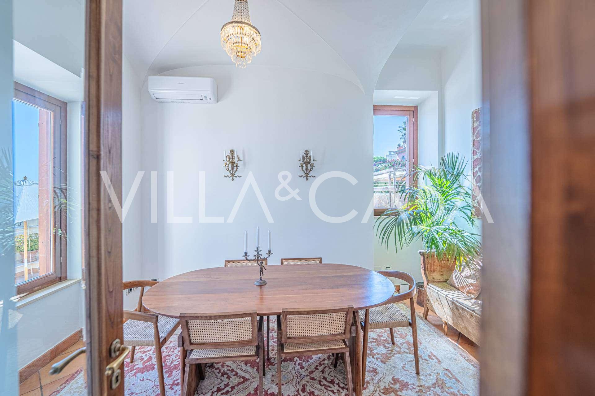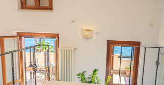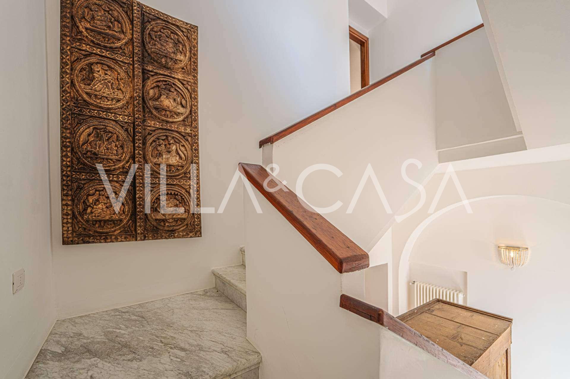 As janelas oferecem uma vista panorâmica de 180 graus para o mar, com o horizonte azul preenchendo cada espaço interior e se estendendo até os amplos terraços panorâmicos. Os interiores, com tetos altos de mais de três metros, pisos de terracota da época, escada de mármore e lareira, criam uma atmosfera de elegância refinada e eterna.