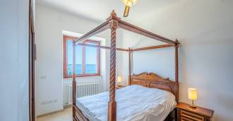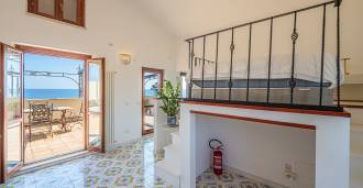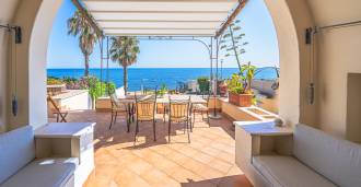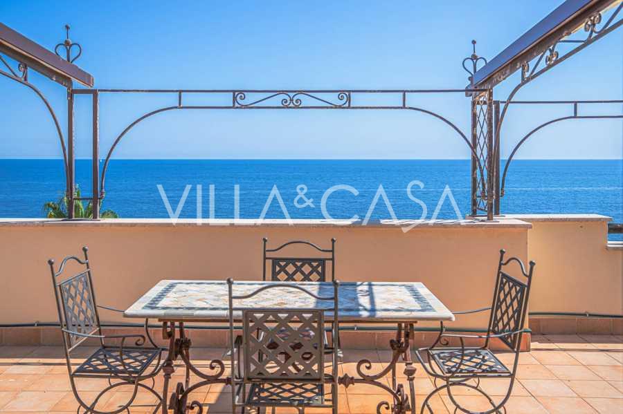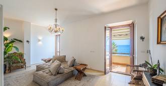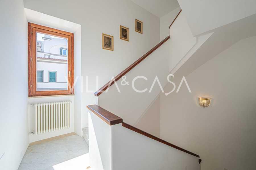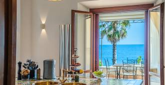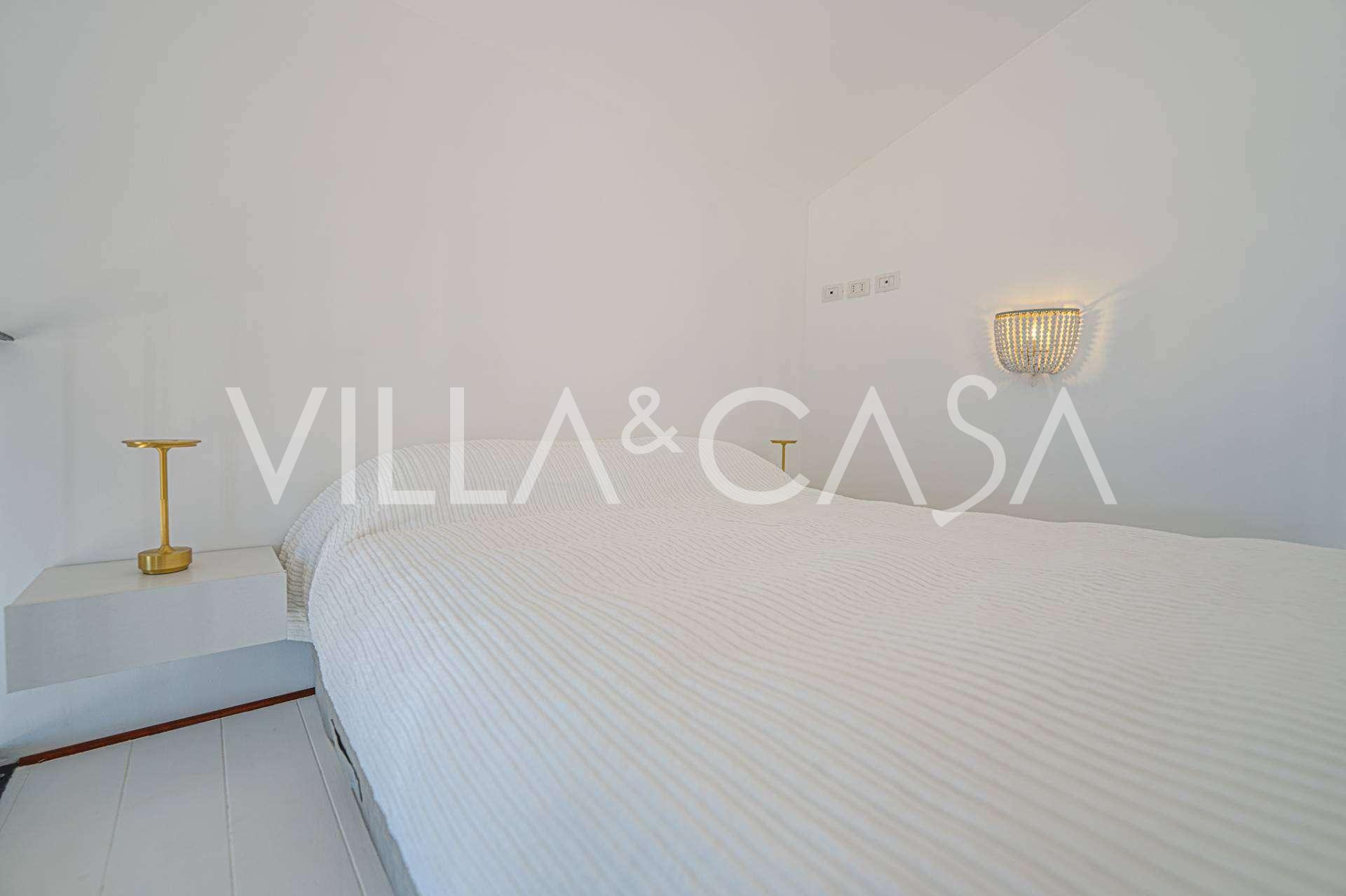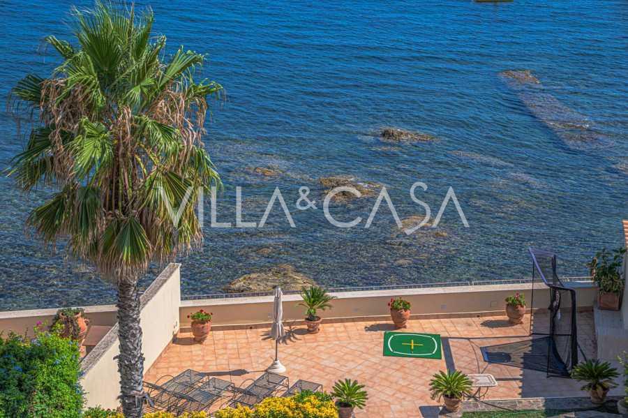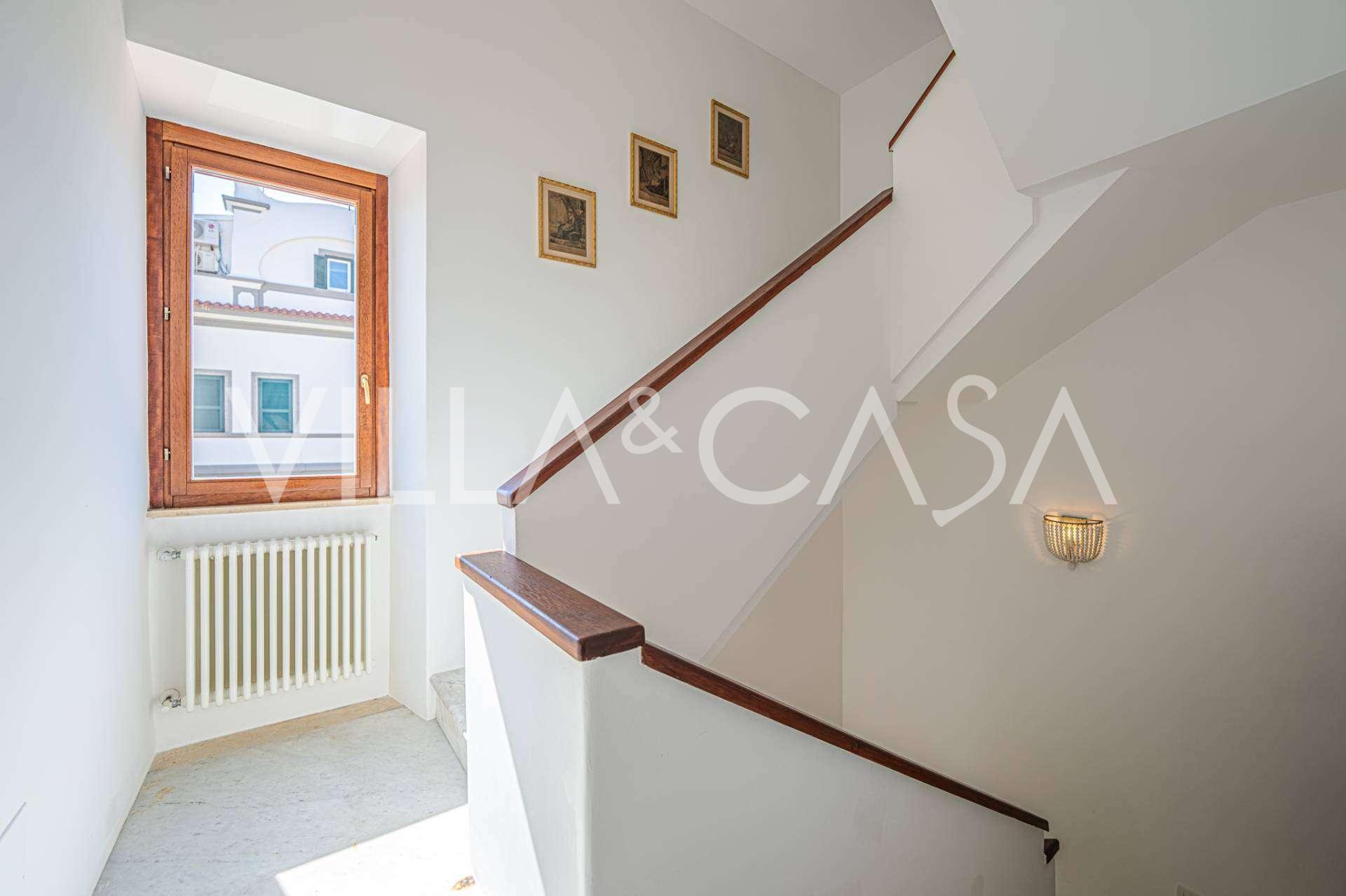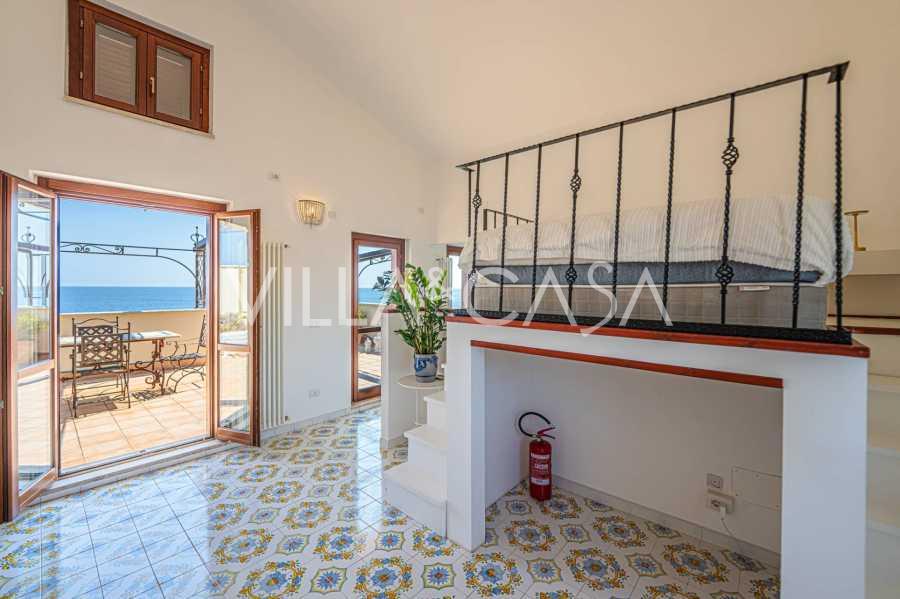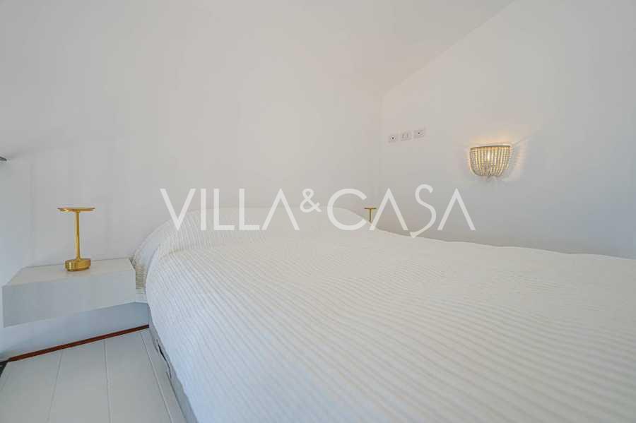 As janelas oferecem uma vista panorâmica de 180 graus para o mar, com o horizonte azul preenchendo cada espaço interior e se estendendo até os amplos terraços panorâmicos. Os interiores, com tetos altos de mais de três metros, pisos de terracota da época, escada de mármore e lareira, criam uma atmosfera de elegância refinada e eterna.