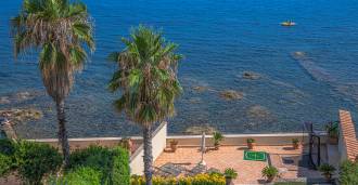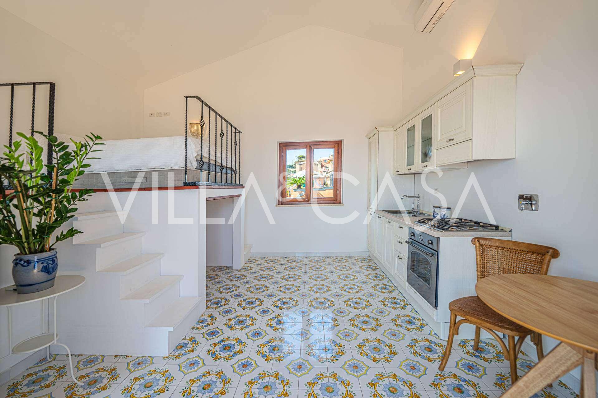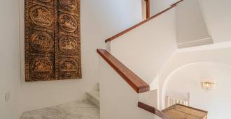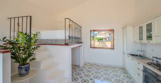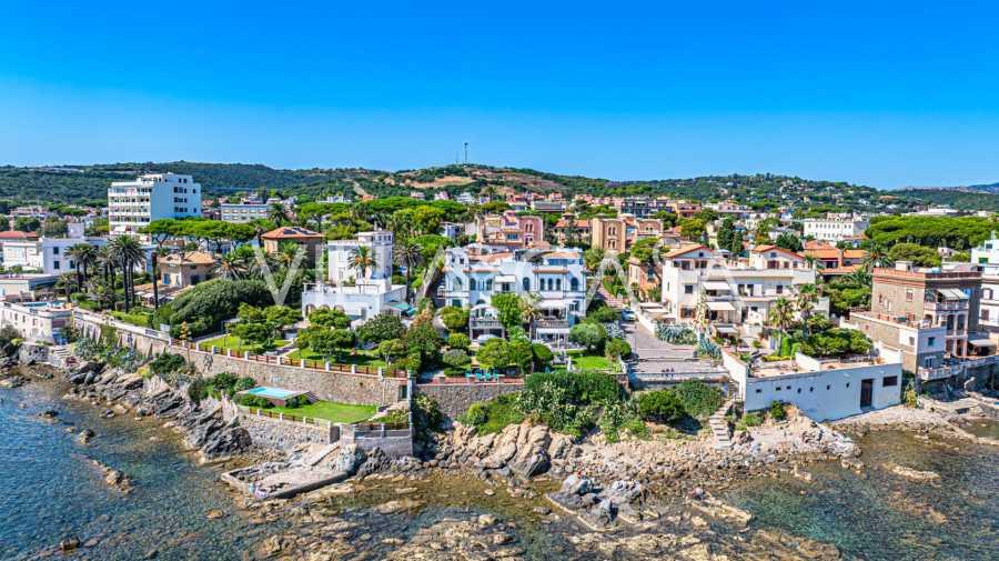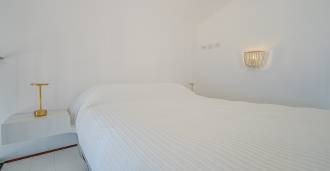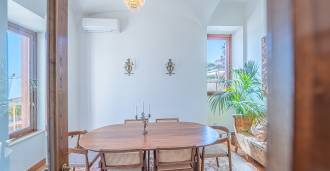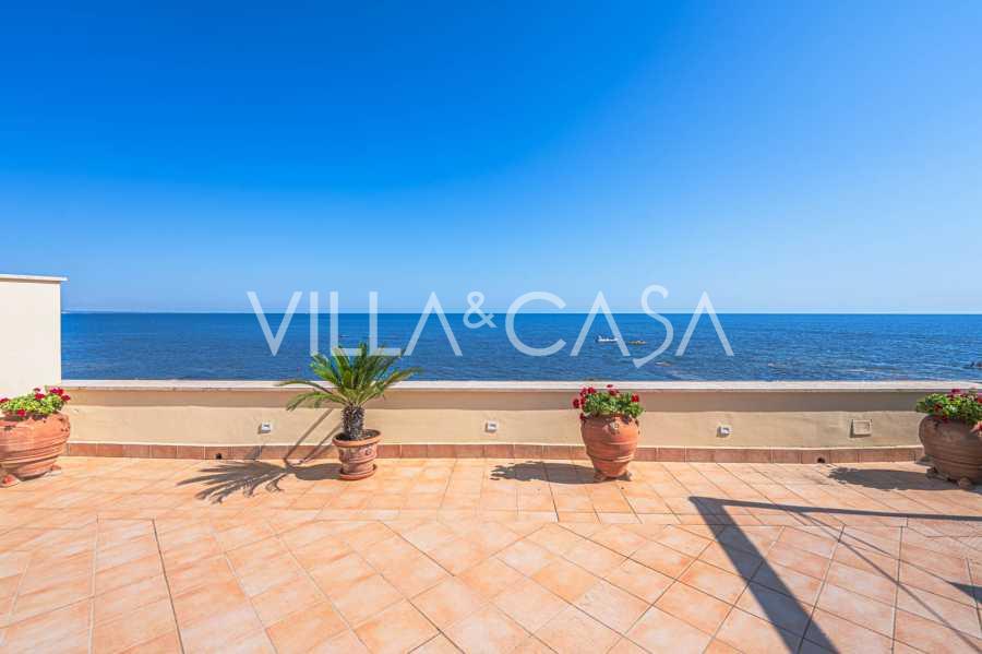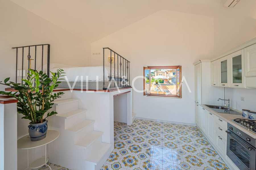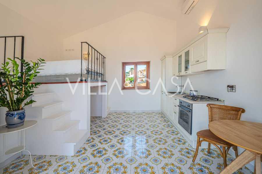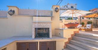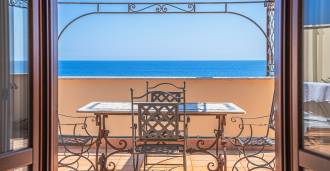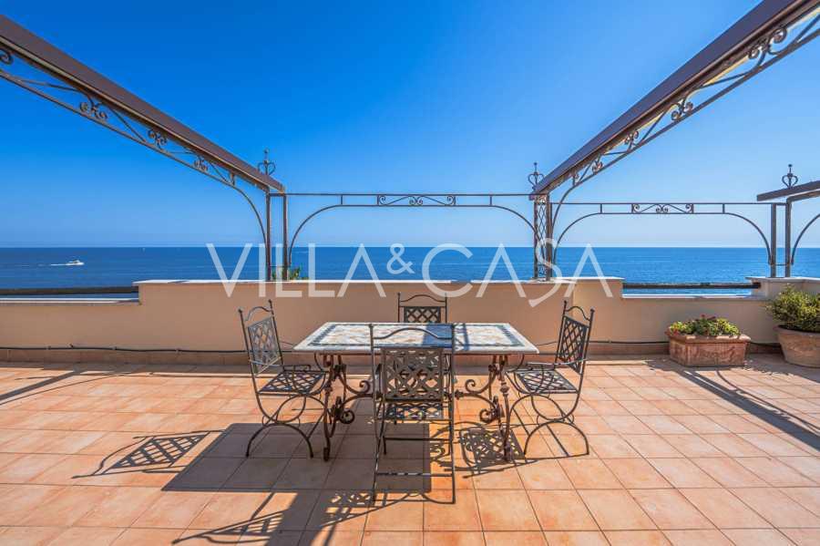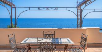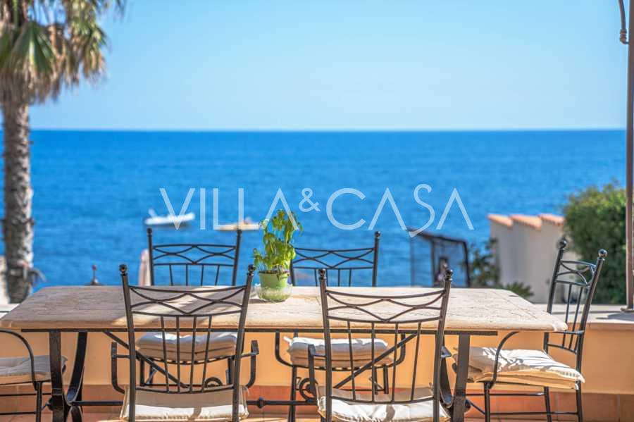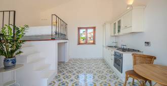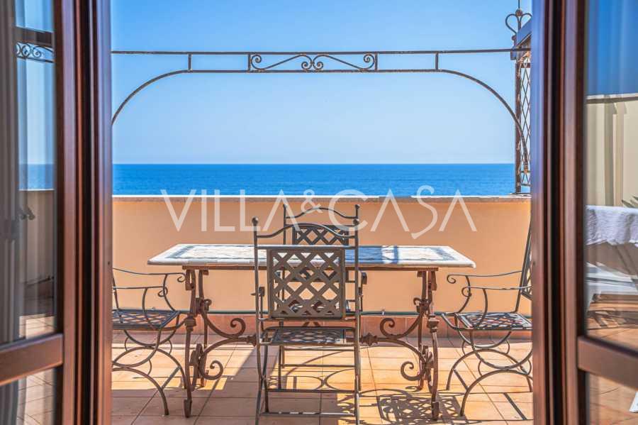 As janelas oferecem uma vista panorâmica de 180 graus para o mar, com o horizonte azul preenchendo cada espaço interior e se estendendo até os amplos terraços panorâmicos. Os interiores, com tetos altos de mais de três metros, pisos de terracota da época, escada de mármore e lareira, criam uma atmosfera de elegância refinada e eterna.
