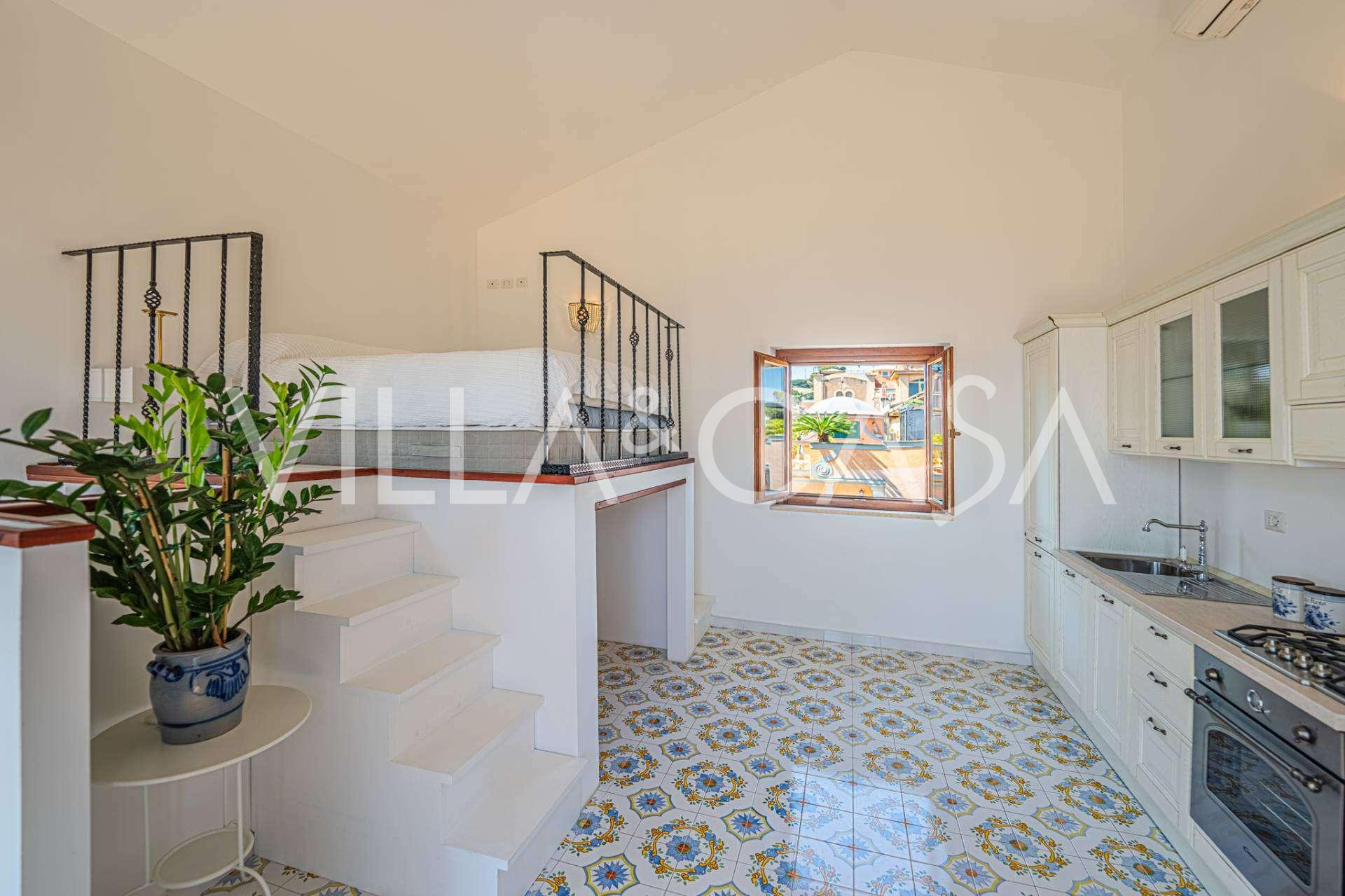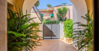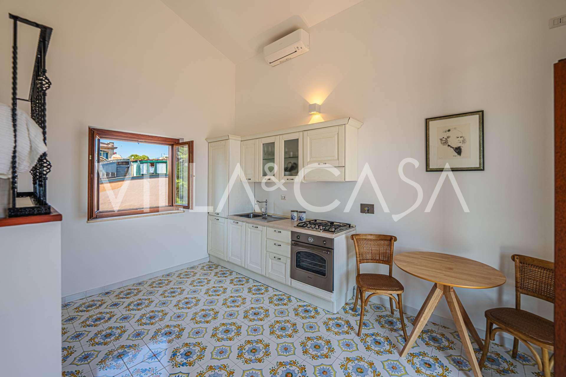 A residência ocupa uma parte de um elegante duplex, garantindo total independência graças a uma entrada privativa, um espaçoso jardim privado de cerca de 800 metros quadrados e acesso direto e privado à praia, algo raro na costa do Lácio.