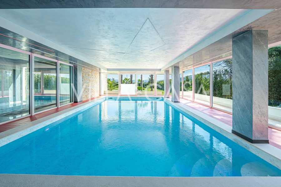 No primeiro nível, também há um escritório com acesso ao jardim, um banheiro de hóspedes e uma área completa de lazer e bem-estar: piscina coberta e aquecida com janelas panorâmicas, área de spa com banho turco e solário, além de uma sala de ginástica.
