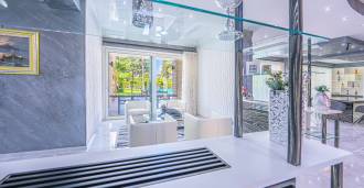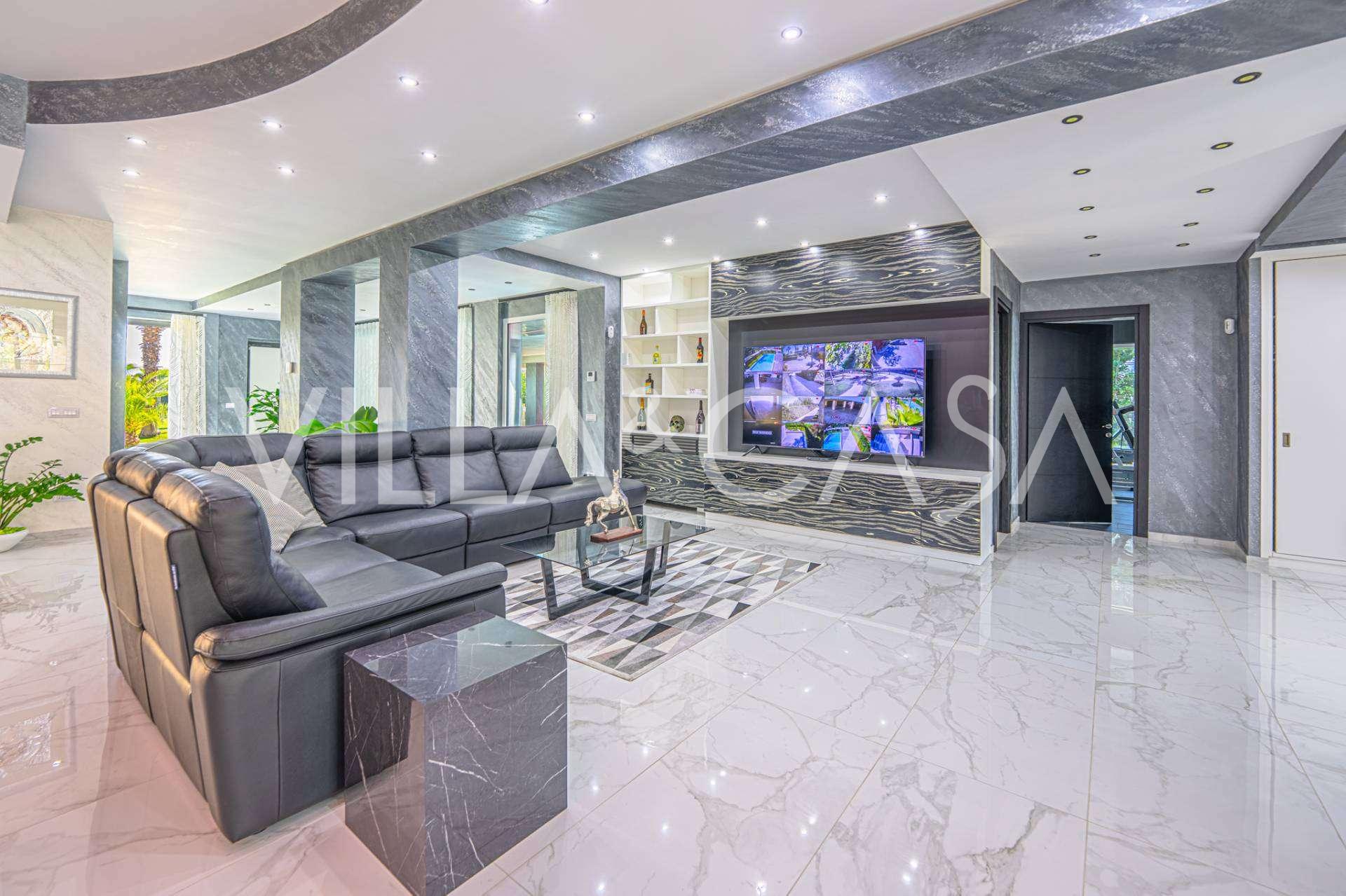 No primeiro andar, abre-se um espaço impressionante com pisos de mármore de Carrara branco e colunas de mármore cinza. A sala de estar, a aconchegante área de TV, a espaçosa sala de jantar com acesso à loggia e ao jardim, além da cozinha moderna com ilha central e área de café da manhã, criam uma atmosfera de total conforto.