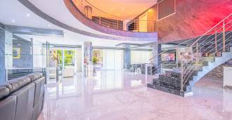 A residência moderna, com cerca de 2000 m², está distribuída em dois níveis, conectados por um elevador interno e uma escada circular. Os espaços amplos e iluminados incluem cinco elegantes quartos e nove banheiros, decorados com materiais de alta qualidade que destacam o status dos interiores.