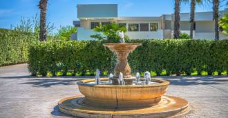 O jardim da villa, adornado com palmeiras, uma fonte com iluminação noturna e uma ampla área de lazer, oferece condições ideais para receber convidados e passar noites ao ar livre junto à piscina ou na loggia sombreada.