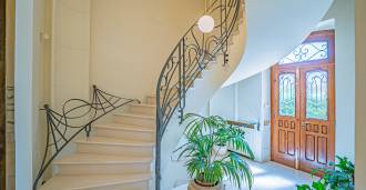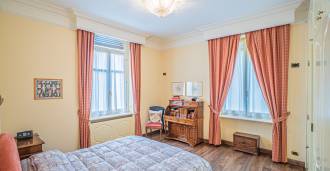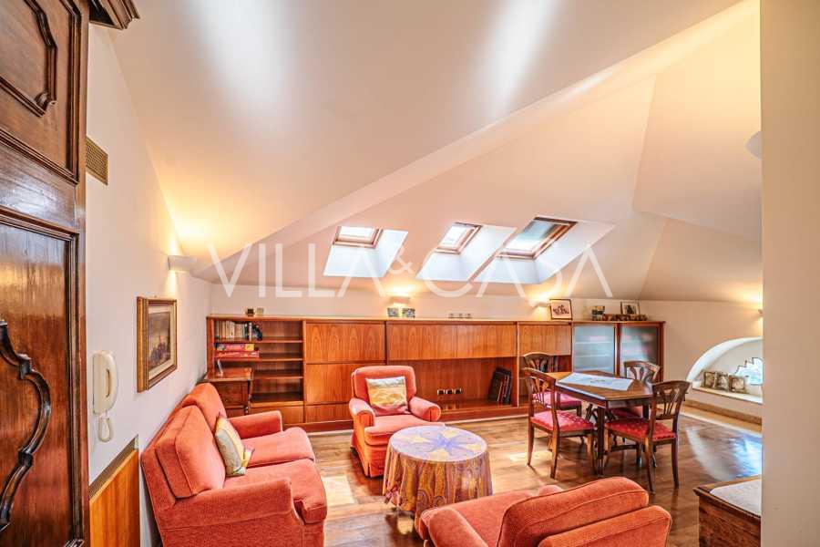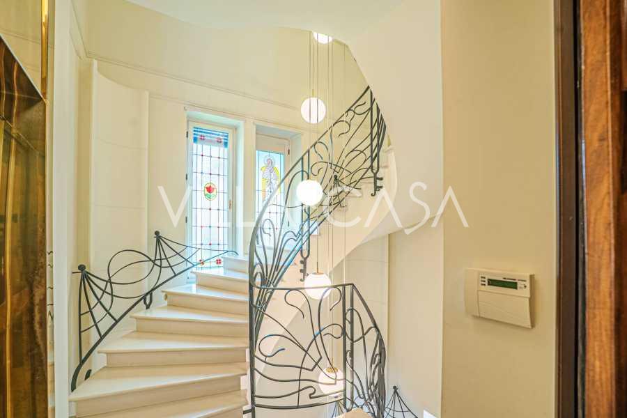 Esta prestigiosa residência com uma área de cerca de 2000 m² está distribuída em 6 níveis, dos quais dois estão subterrâneos. Todos os andares são conectados por uma escada em espiral de mármore branco com elegantes corrimãos de ferro forjado, e também há um elevador que proporciona movimentação confortável entre os níveis. Os interiores são banhados por luz graças às altas janelas com vitrais feitos à mão, e a casa preserva antigas lareiras com chaminés de terracota, feitas por artesãos de Albisola segundo modelos originais.